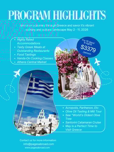 This experience is offered through Pages Abroad, an organization dedicated to creating opportunities for individuals to learn and experience Mediterranean diet and way of life. The program is curated by Randy and Tana Page. Randy is an Emeritus Professor of Health Promotion at Brigham Young University, and Tana was an Adjunct Professor also at BYU. Together, they have taken 900+ BYU students to more than 30 different countries on five continents. Now they are focused on sharing their students' rich experiences with others in boutique style "study abroad" tours.