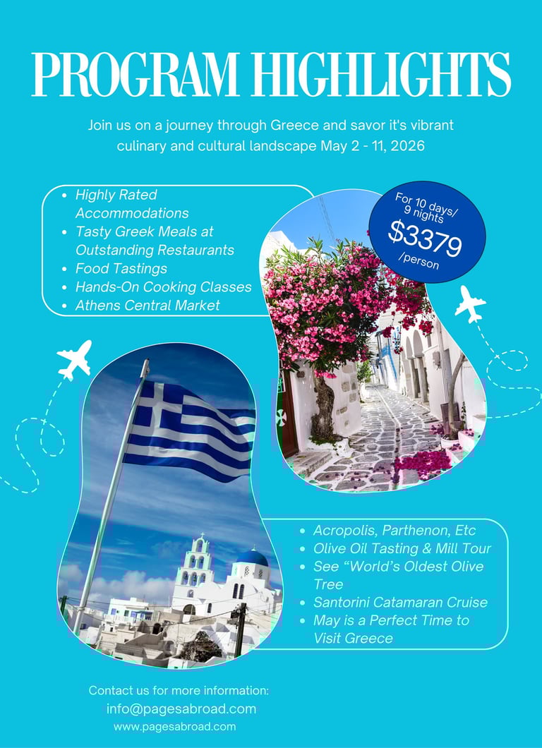 Included in price: Accommodations (9 nights) • Land/Ground Transportation • Airport Transfers (Athens to Athens Airport on May 5th, Round-trip airport transfers in Chania; Round-trip airport transfers in Santorini • Cooking Classes (Athens & Crete) • Cooking Lesson/Demo (Santorini) • Santorini Cruise • Acropolis & Parthenon • Field Trip/Day Trips in Crete • 14 Lunches or Dinners (including those as part of activities) • Food Tastings • Olive Oil Tasting & Mill Tour • Water at Meals (Still or Sparkling)