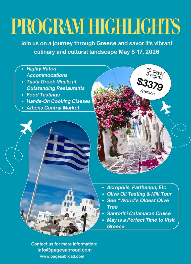 Included in price: Accommodations (9 nights) • Land/Ground Transportation • Airport Transfers (Athens to Athens Airport on May 11th, Round-trip airport transfers in Chania; Round-trip airport transfers in Santorini • Cooking Classes (Athens & Crete) • Cooking Lesson/Demo (Santorini) • Santorini Cruise • Acropolis & Parthenon • Field Trip/Day Trips in Crete • 14 Lunches or Dinners (including those as part of activities) • Food Tastings • Olive Oil Tasting & Mill Tour • Water at Meals (Still or Sparkling)